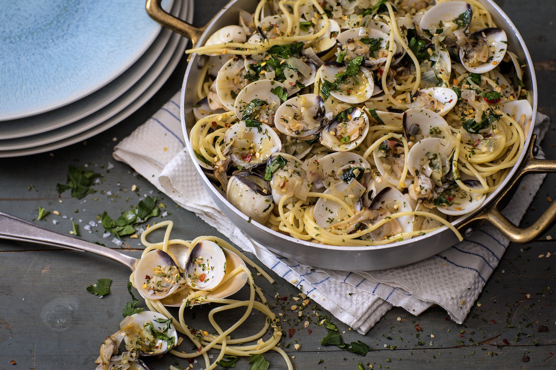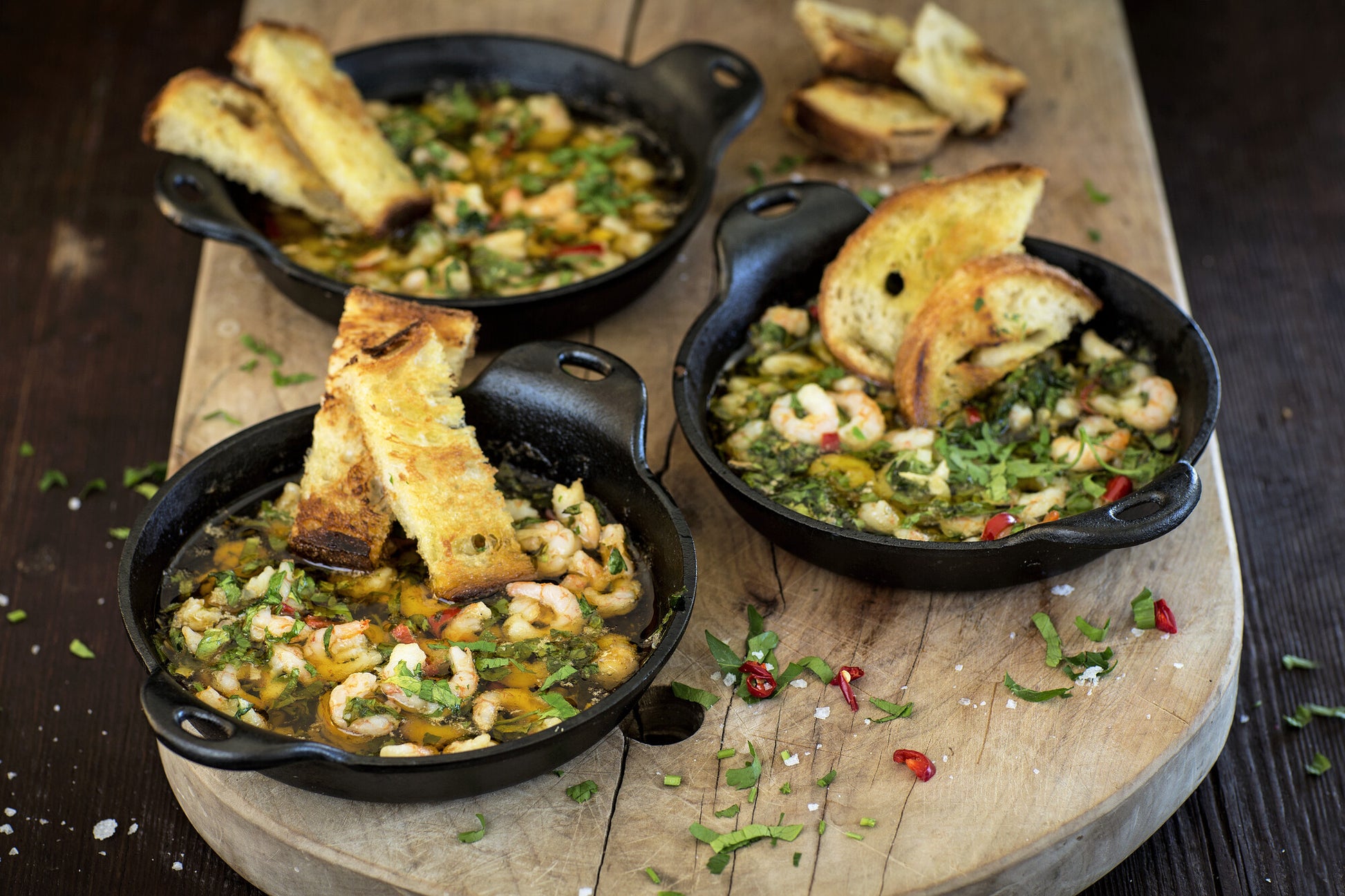Gehackter Knoblauch, Petersilie, Fleur de Sel, Chiliflocken.