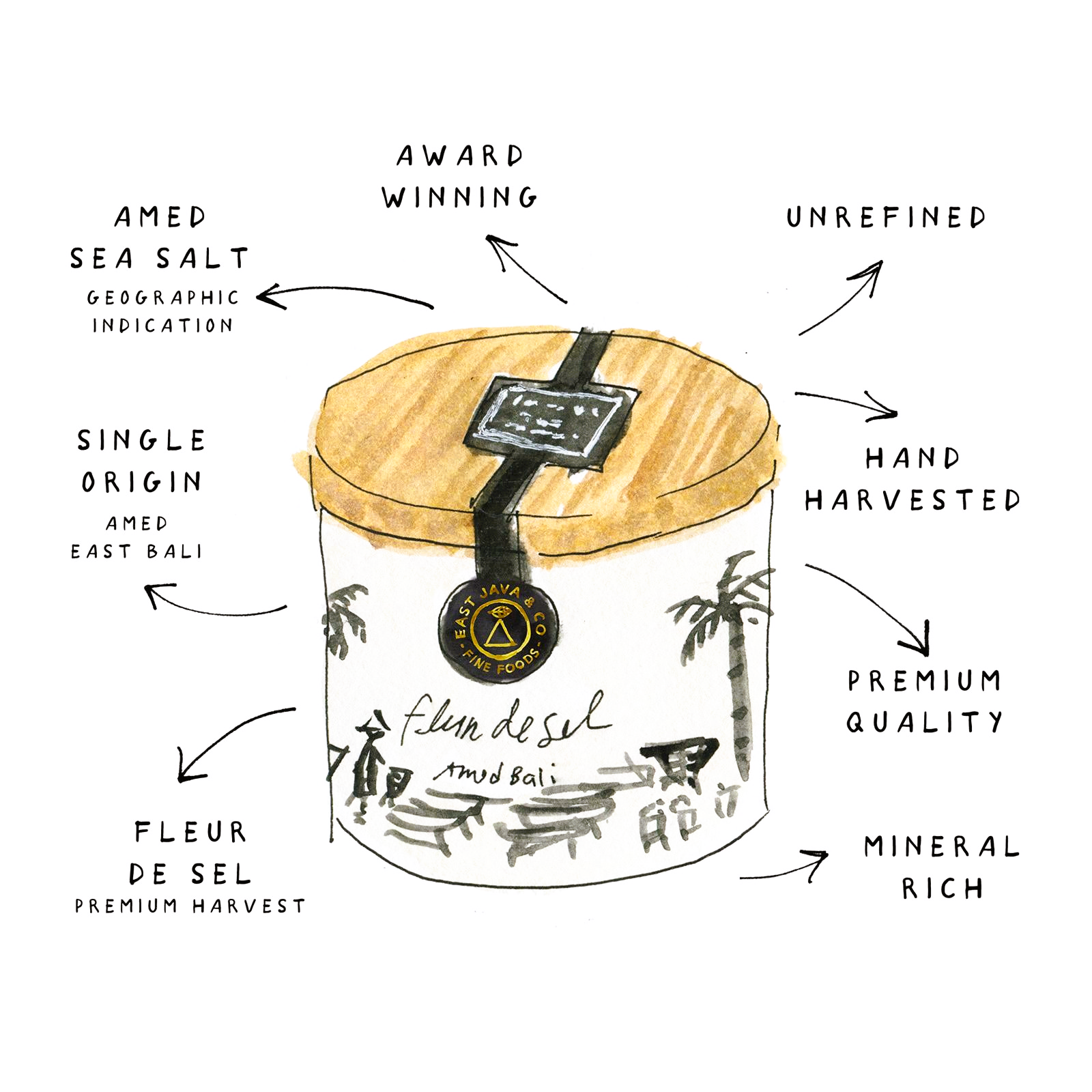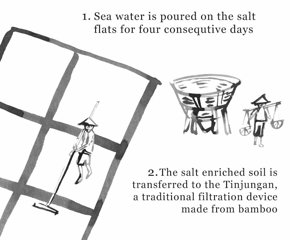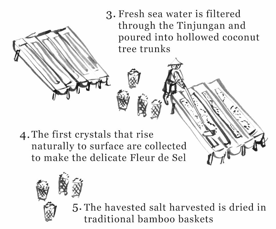 In Amed, an der tropischen Ostküste Balis, wird dieses besondere Fleur de Sel von Hand in Kokospalmstämmen gewonnen – eine Methode, die bis ins 17. Jahrhundert zurückreicht. Damals wurden die Salzfarmer aus Amed zu den königlichen Salzproduzenten der Karangasem Regentschaft ernannt.