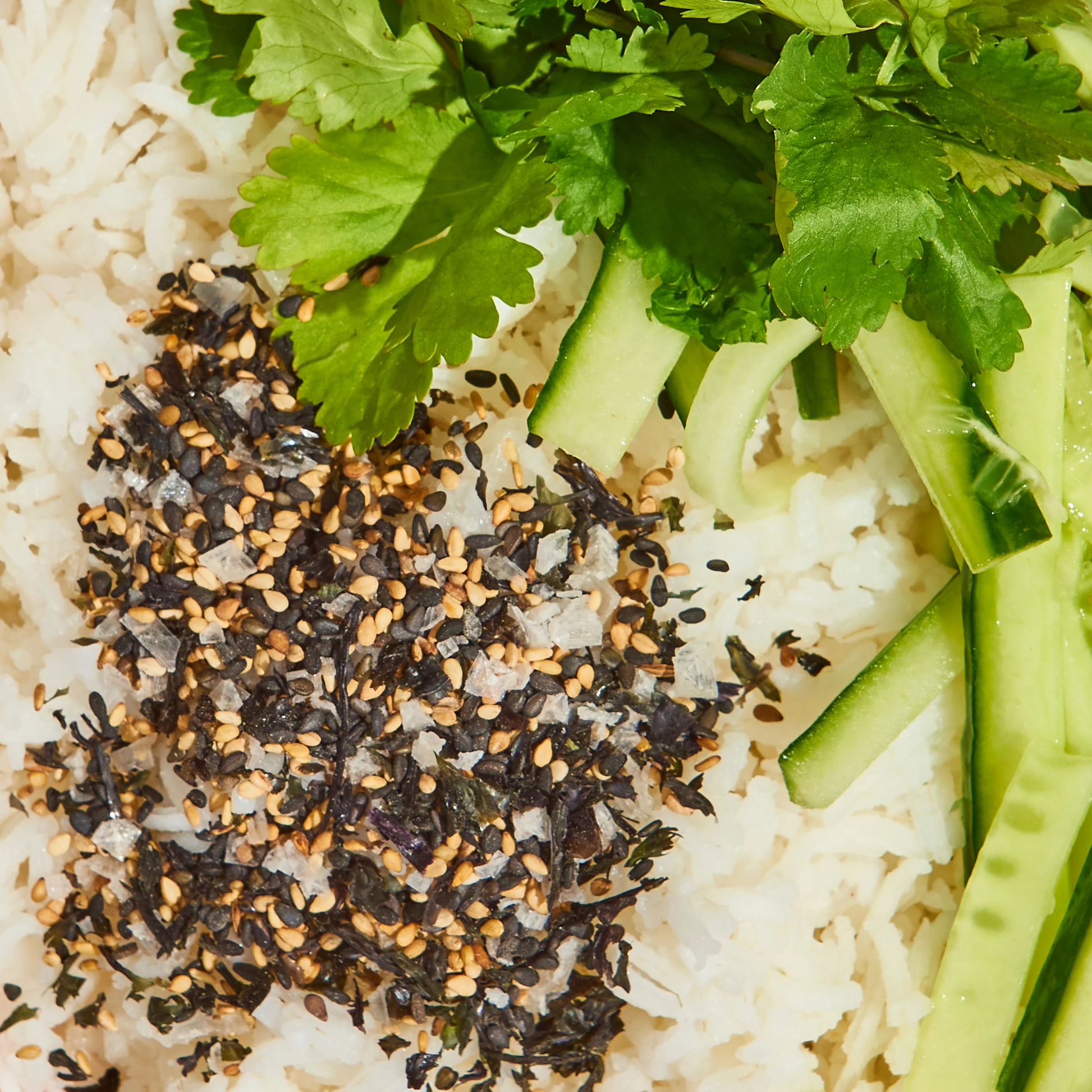 Weißer SESAM*, Schwarzer SESAM*, Salz, Shiitakepilz*, Nori*, Meeresalgen* (Meersalat)