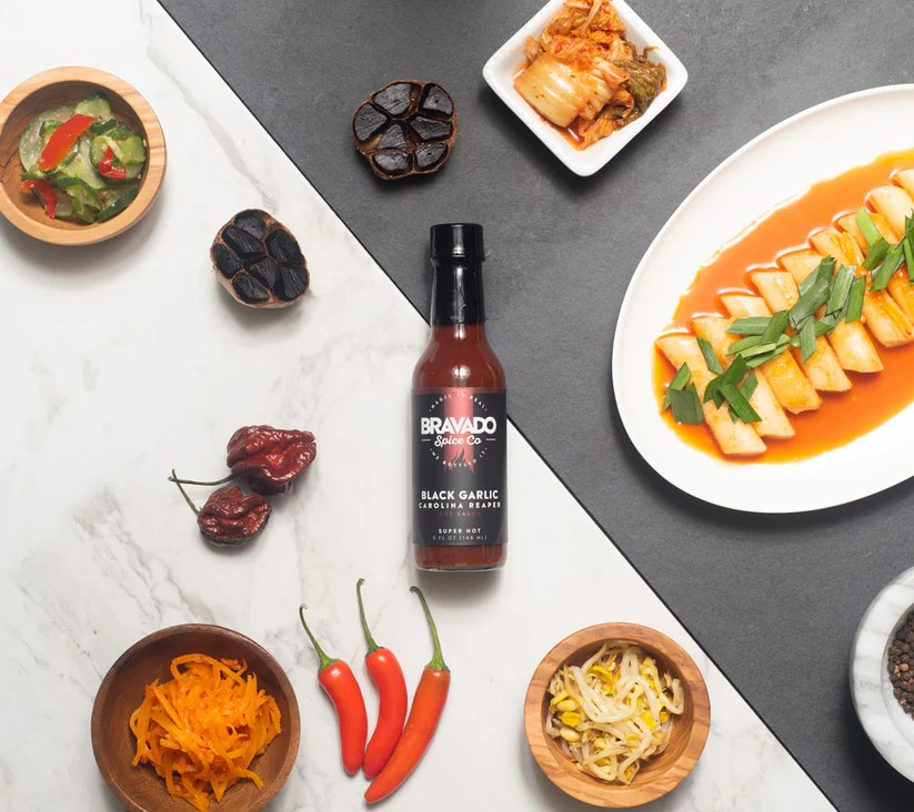 Die Black Garlic Carolina Reaper Hot Sauce von Bravado Spice Co. vereint Umami-Tiefe mit extremer Schärfe – ein Meisterwerk aus schwarzem Knoblauch & Carolina Reaper.