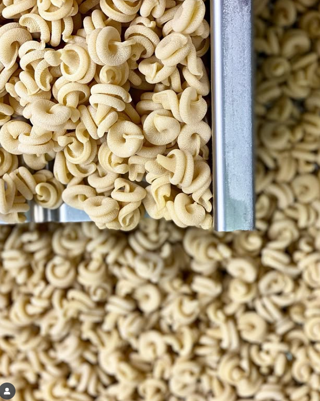 Verwendet wird ausschliesslich italienischer Hartweizen der Sorte Senatore Capelli – eine alte, hochwertige und besonders geschmacksintensive Weizensorte. Daraus entsteht ein Teig, der durch Bronze-Matrizen gepresst wird. Das Resultat: Eine samtige, leicht raue Oberfläche, die Saucen perfekt aufnimmt.