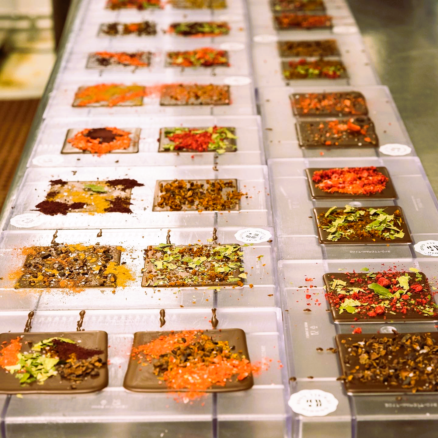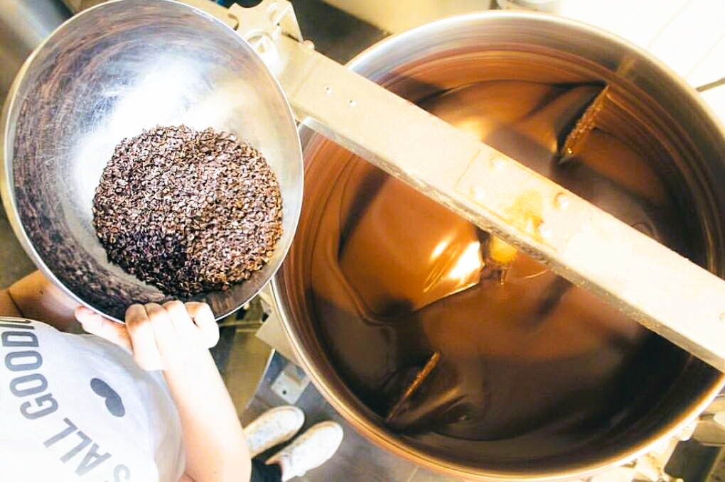Die samtige Konsistenz unserer Schokolade erreichen wir durch dreitägiges Steinmahlen, eine traditionelle Technik, die die wertvollen Nährstoffe der Zutaten bewahrt. Nach dem Temperieren wird die Schokolade in Formen gegossen und gekühlt.