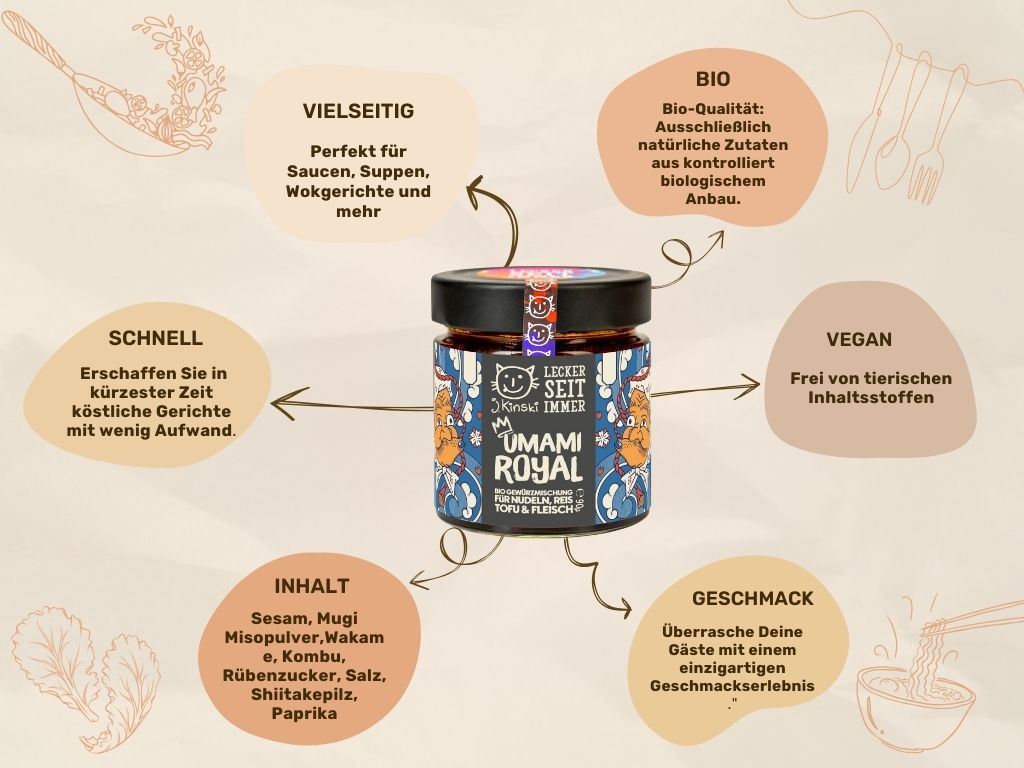 Mit Umami Royal bringt J.Kinski die Essenz des fünften Geschmacks in deine Küche: Mugi Miso, Meeresalgen, Shiitakepilz, Sesam und Paprika verbinden sich zu einer aromatischen Komposition, die Tiefe, Würze und Komplexität verleiht – ganz ohne tierische Zutaten.
