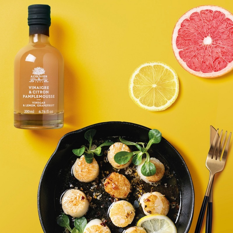 Zum Rezept gebratene Jakobsmuscheln mit Zitronen-Grapefruit Essig: